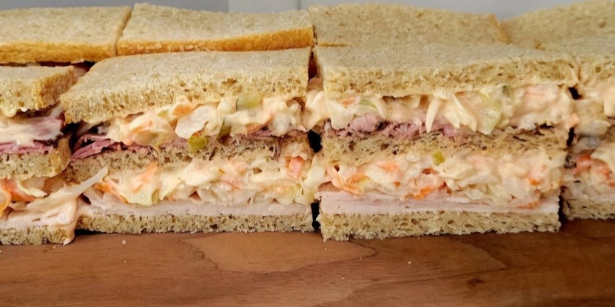 Our Sloppy Joes are made with two layers of deli meat (turkey, pastrami, roast beef or corned beef) house made brined slaw (no mayonnaise) and house made Russian dressing plus optional cheese... All stacked on three slices of homemade 1/4 inch thick Pullman rye. All sandwiches come with our house made half sour pickles.